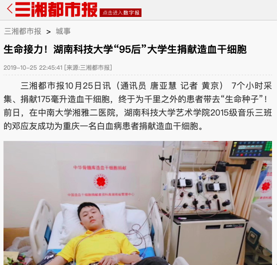 三湘都市报10月25日讯(通讯员 唐亚慧 记者 黄京) 7个小时采集、捐献175毫升造血干细胞,终于为千里之外的患者带去“生命种子”!前日,在中南大学湘雅二医院,bwin必赢唯一官方网站艺术学院2015级音乐三班的邓应友成功为重庆一名白血病患者捐献造血干细胞。